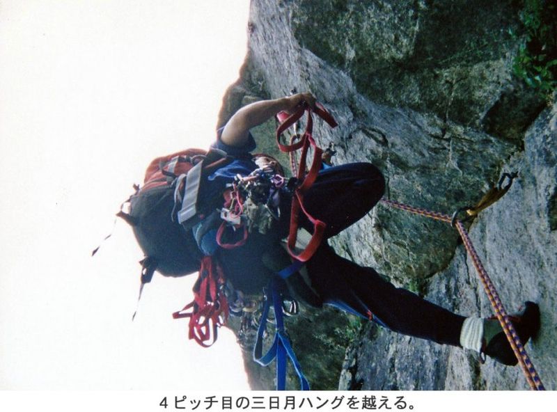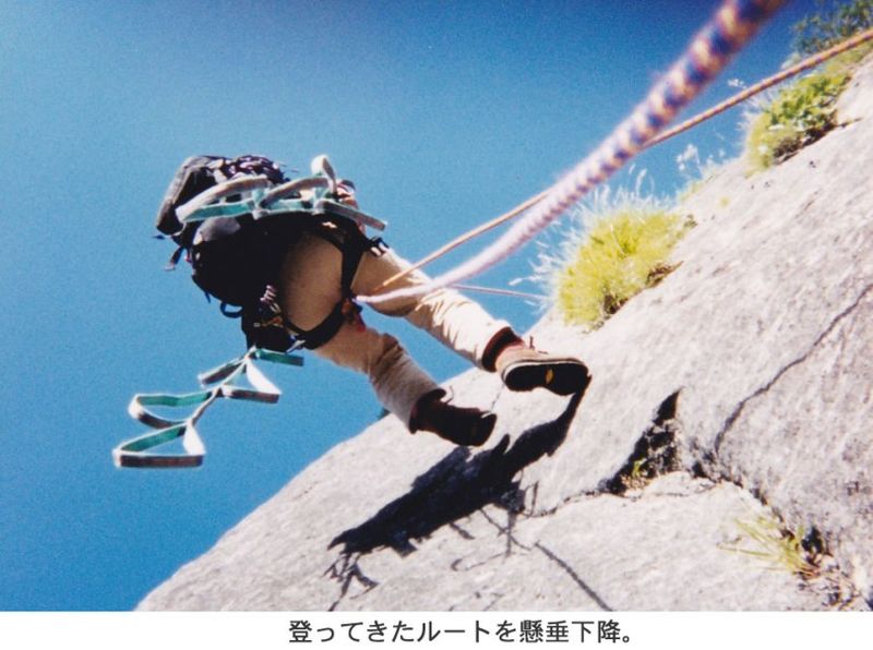 翌朝、懸垂下降で登ってきたルートを降りることにする。1ピッチ目は草付き15mでテラス。次のピッチは30m下降して2mほどトラバース、ボルトに足先をひっかけてアブミビレイの支点までたどり着く。3ピッチ目は20m下のレッジまで。4ピッチ目は三日月ハングを越えて40m下のテラスまで。そして最終ピッチ40mで取り付きへ戻った。アブミビレイ支点からの懸垂下降は初めてだったが、結構恐かった。壁は垂直なのでわざわざロープダウンしなくても、自然にスルスルと落ちてくれたが、万が一ロープがすっぽ抜けるとアウト、人間が2人残置状態となってしまう。また、小さなミスでも死につながる。