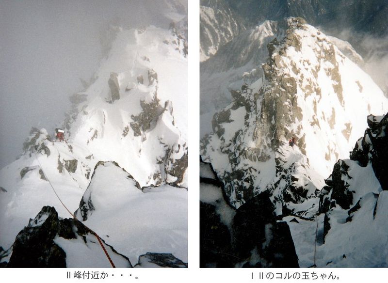 いよいよ岩のピッチが出る核心部の3峰である。このためにザイルを担いできたのだ。コルから少し登ったところが確保支点。私は重荷でめげているので玉ちゃんリード。1ピッチ目は支点から3mほどトラバースして凹角を登り、行き詰まったところで左に回り込み直上する。ハーケンはところどころにあるが左に回り込む前後がいやらしい。荷物が重いのでちょっとでも後ろにひかれると岩から剥がされそうになるのだ。