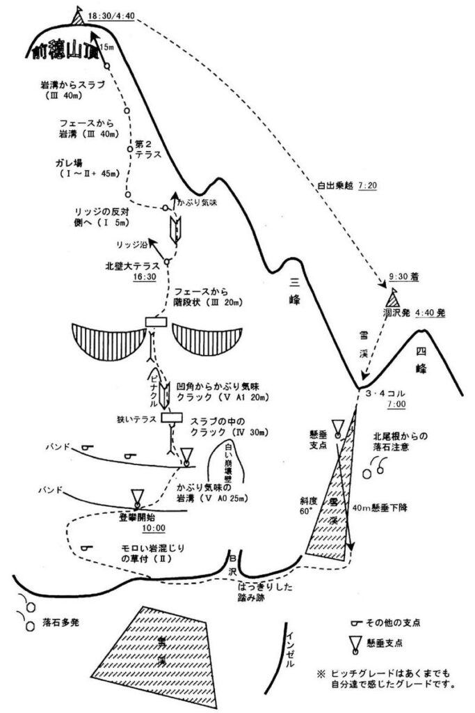 今回登った前穂東面は今までの登攀の中で一番アプローチが大変だった(撤退するのも大変だろう)。また、谷川岳以上に頻繁に落石があり、北岳Bのピラミッドフェースと同様にルートファインディングも難しかった(フェースはRFが難しい)。また、ギア類の他に玉(ガス、ジャンピング、無線機)、坂(ツェルト、医薬品)、それぞれ12本爪アイゼン(これが重い)とピッケルなど背負っていてザックの重さを感じた。ルート上のハーケン類は全て古いものであり(初登は1957年)、打ち足しもなかったが、穴が大きいので、ほとんどヌンチャクをかけられる。古川ルートはガイドではピッチグレードV+、ルートグレード4級下のルートであるが、ポピュラーでなくピッチがVを越える時はあぶみを出しておいた方がいいな、と感じた。さらに、下部についてはガイドによってルートやグレードが異なるのでわかりにくい。