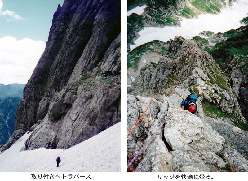 熊ノ岩を越えると雪渓はかなり急になり、もう雪壁だ。ピッケル・アイゼンをつけていてもヤバイなぁ。滑落して頭から血を流しているクライマーを横目で見ながら、とても僕らにはノーアイゼンで登る勇気はないと思う。3時間半のきつい登りを経て池ノ谷乗越を越える。そこから西側のザレザレで急な池ノ谷ガリーを慎重に下っていき、やっとチンネ登攀の起点となる三ノ窓へ着く。チンネは遠いのだ。取り付きはチンネ基部、左端の小バンドだ。左稜線のスカイラインを眺めながら急な雪壁をトラバースして、10時いよいよ登攀開始。