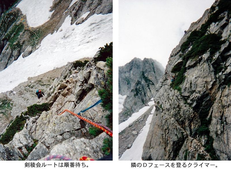 中大ルートや久留米大ルート、RCCルート・・・、それぞれ短いルートだから1日に3本ぐらいは登れるだろうと思っていたが甘かった。3時間もかけてやっとの思いで長次郎雪渓を登り、八ツ峰Ⅵ峰の岩壁を見て唖然。「ここは三ツ峠か?」どのルートもゲレンデ並みの大混雑だ。とりあえず有名な剣稜会ルートに取りつく。5ピッチ。1~2時間で抜ける予定だったのにとんでもない。なんせビレイポイントごとに2~3パーティが詰まっていて、1ピッチに1時間以上かかってしまった。ルート自体もあっけなく手応えがなくてつまらなかった。ルートの魅力とはグレードを追うことだけじゃないことは十分わかっているけど、なにも☆☆☆をつけるほどのルートではないと思う。全体的に三ツ峠の一般ルート(中央)に似ている。