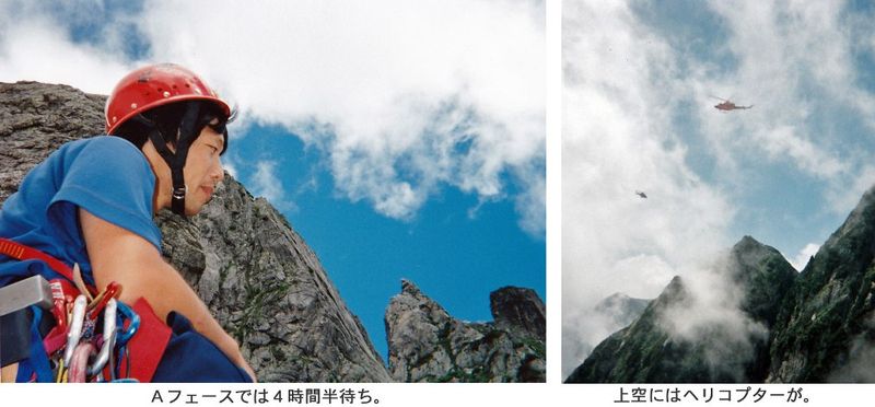 長次郎雪渓を登るのも4度目になると愛着さえ湧いてくる。(登攀が目的ではなくてもぜひ登る価値があります)今日も八ツ峰の岩場は大渋滞だ。Aフェースの基部で順番待ちの列の最後尾に付く。1時間経っても2時間が過ぎてもまったく動かない。どぉーなってんだまったく!!一緒に順番を待っている他のパーティーとも親しくなり、けっこう楽しくのんびりとした待ち時間を過ごす。さらに3時間、4時間…。ひたすら待つ。結局ルートに取りついたのは15時30分。なんと4時間半も待たされてしまった。ルートは3ピッチ、1.5時間で抜ける。1ピッチ目(Ⅲ+)が意外と難しくて楽しく、剣稜会ルートよりも面白いルートだと思う。