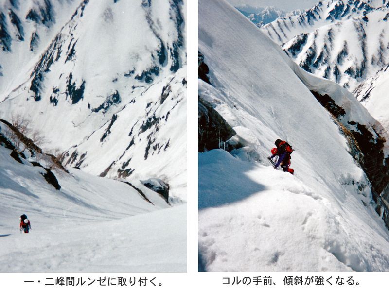緩やかに見えたルンゼは登るにつれて傾斜を増してくる。ダブルアックスでガシガシ登っていくと、右側のかなり急な方へ寄りすぎて、セミになってしまった。足元は小さな氷片がたまっていて不安定だ。ルンゼは砂時計のように真ん中でいったん細くくびれていて、雪崩れるとそこに集中するのでヤバイ。中間部を過ぎてもまだ急な斜面はずっと続き、途中で休める場所がないので精神的にもつらい。一ノ倉尾根のダイレクトルンゼをもっと長くした感じで、ずっと緊張させられる。うんざりするほど長く感じた。9時30分、ようやく一・二峰間のコルに到着。突然、後立山連峰の大パノラマが目に飛び込んできた。八ツ峰の末端から登ってきた(スゴイ!)龍谷大学の二人パーティーに会う。聞けば三ノ窓まで行ってチンネを登攀すると言う。(スッゲー!)