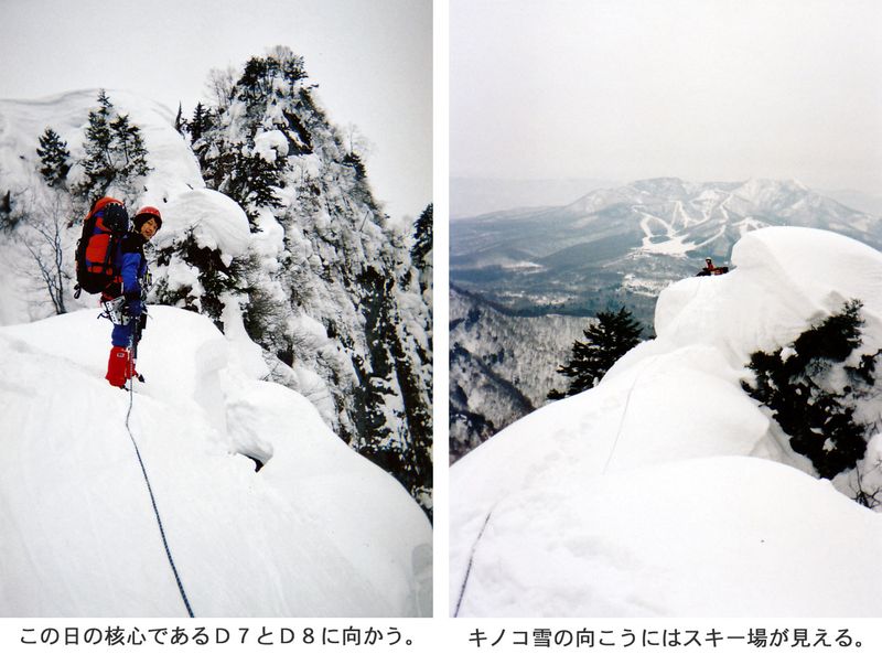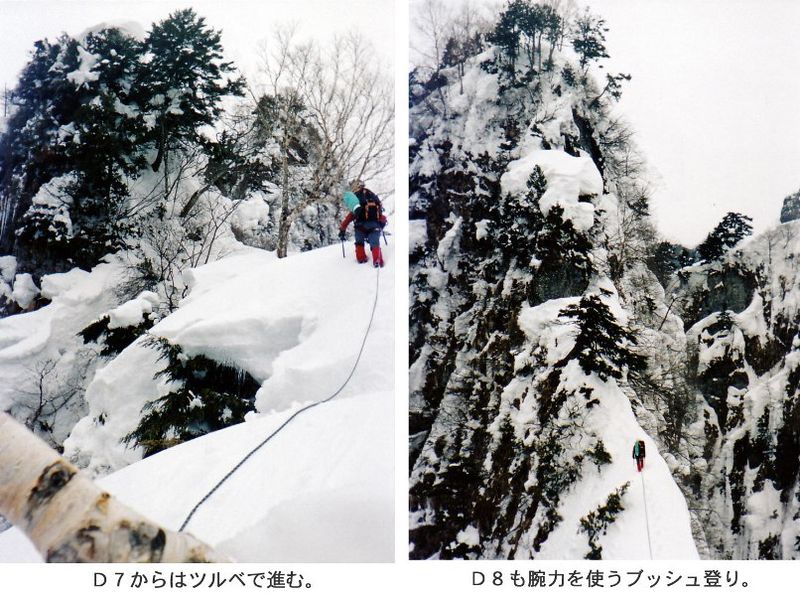ここからツルベ。D7は、基部の草付バンドを岩をホールドにして左に2mほどトラバース。ブッシュ混じりのルンゼを登り、雪面を右上しながら主尾根に戻る。