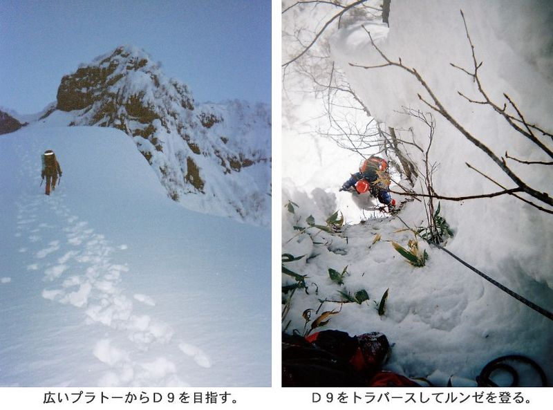 同じように数mほど登って、右側を見ると、D9と同じようにルンゼがあり、先行はそこを登ったようだ。ルンゼ側に入ると、足場の雪が崩れてズルリと滑った。一段乗ればルンゼ状なのだが、足元がどんどん崩れて乗越せない、ここはザックあげるの大変だなあ… と思う。なんとか腕力で乗越し、ルンゼを登って左に抜けると主尾根に戻った。