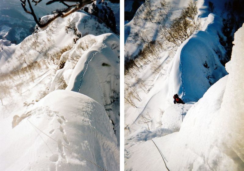 この先、懸垂20m(木にシュリンゲの支点あり)でギャップに降り、大休止。右手にはキノコ雪のついた側壁が広がる。結構疲れた。そんな感じに気づいたのか、次のピッチを玉ちゃんがリードしていく。