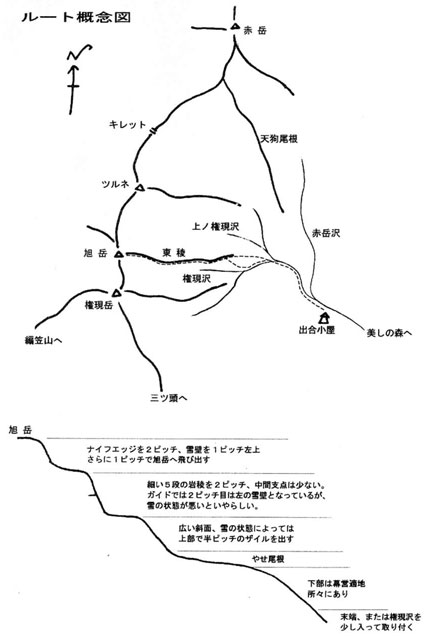 翌朝も4時起床、6時にテントを撤収しはじめる。今回の私はテント持ちなので、リードはないもんね、と余裕で岩の基部へ。なのに、私が空身でリードすることになってしまった。右上にガバはあるが届かないので、ピッケルで身体を持ち上げてダケカンバを掴み、1段目の岩を乗っ越す。指先が冷たい。2段目は何ともない岩で、3段目の岩はちょっとバランス悪いなあ、という感じ。支点がないのでピッケル1本を基部に埋め込んで中間支点とし、再びピッケルで身体を持ち上げて乗り越えて、ビレイ解除。指先が冷た~い!セカンドのキジ坊はプルージックで、顔を吊り上げながら登り、ラストの玉ちゃんは私のザックとともに引き上げた。2ピッチ目は玉ちゃんがリード。ルート図では左の雪壁なのだが、4段目の岩の右側から。足元の不安定な雪壁の上部はザックにうるさいダケカンバ、5段目の岩場もザック持ちには少々バランスが悪い。3ピッチ目と4ピッチ目はやせ尾根で、5ピッチ目は雪壁を左上に巻き込みながらキジ坊がリードする。そして、最後の6ピッチ目は旭岳の頂上まで玉ちゃん。風が強いけど相変わらず360度のいい眺めだ。