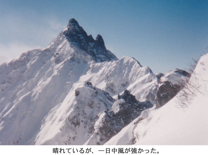 やっと我々の順番になる。15mほどの雪のルンゼはダブルアックスでクリア。登りきると、また風がビュウビュウ。若者やその他のパーティは順番待ちをさけて、トラバース跡を目指していった。独標ピークの陽だまりにつくとGの面々がいた。久し振りに風がしのげてホッとする。この先のP11から14は岩峰群だが、風の強い千丈沢側をトラバースしなければならない。黒々と聳える槍ヶ岳が遠くに見える。その手前のP15までポツポツと人が見える。もう、あそこまで行っているんだなぁ、自分達はどこまで行けるかなぁ、と思う。