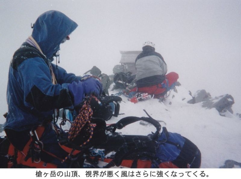 次の確保支点40mまで2ピッチで登り、ルンゼ通しに岩と雪のミックスを登ると、岩の直上と左側ヘトラバースするルートになる。浜松は直上に行ったが、我々とぶなの人はトラバース。登りきって振り返ると、ひょっこり山頂の祠があった。浜松の姿はもうないが、Gのリーダーが登ってきたのを見て、ぶなの人に続き我々も下降する。山頂で喜び合うなんて状態ではない。風はだんだん強くなってくる。視界が悪いのでぶなの人を追いながら、道を見失わないように注意する。肩の小屋の冬期小屋に入ってホッと一息。小屋から槍の穂先が見えないくらい視界が悪い。