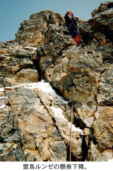 硫黄岳から硫黄台地の間はとても広くて気持ちがいい雪稜だが、ガスッてるとルートファインディングに苦労する所だろう。右手のブッシュ際のところを進んだ後、出口は左寄り(南南西の方向)に灌木の生えた尾根を50mほど下る。尾根が細くなり行き詰まったら、右手が雷鳥ルンゼの懸垂下降20mだ。支点は木から。そのあと尾根を左へ回り込んでさらに2ピッチ×20mほどの懸垂。このあたりはまるで迷路のようになっていて、うっかり下りすぎてしまうと登り返しが大変だし、かといって急な雪稜の微妙なトラバースは危険でイヤなものだ。雪はもう腐ってグサグサだし、岩は脆く不安定で精神的にもストレスがたまってくる。次々と課題を乗り越えていくフィールドアスレチックのような面白さはあるけど、失敗したら1000メートル滑り落ちて御陀仏である。
