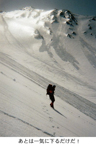 朝テントを出ると昨日の雨がまるで嘘のようにピーカンの快晴。目の前にはドーン!と北鎌尾根と槍ヶ岳がある。みんなよりも1時間ほど遅れてあわてて出発。まずは大きな硫黄岳へと登り始める。細い雪稜から凹状の雪稜。かなり急なのでいきなり息があがる。途中、岩が露出している所は左から巻いてブッシュをつかんで越える。2時間かけて大汗もかいてようやく広い硫黄岳のピークで一服した。ここでやっと硫黄尾根の全貌が眺めることができる。槍ヶ岳を頂点として天を突き刺すようにしてグングンと延びていく北鎌尾根。これと並走して地味にいくつもの小ピークを連ねて、長くのびている硫黄尾根。「う~ん。やっぱり北鎌尾根は美しくカッコイイ。」と改めて思った。かの松濤明(登歩渓流会)も、春の硫黄尾根を単独で初登攀した際に熱い思いで北鎌尾根を眺めていたんだろうか?もっとも彼はノンサポートで厳冬の北鎌から、さらに穂高・焼岳までの大縦走を企てていたのだが…。(当時としては、かなり時代に先んじていた。)