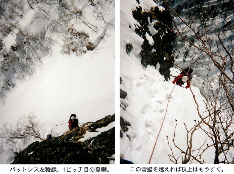 ここでザイルを出して、まず玉リードで50mいっぱいにのばして立木でビレイ。つづいて鶴リード、傾斜はさらに立ってくるし、フカフカの雪なので慎重にザイルをのばしていく。左上バンドのルートファインディングに少し手間取ったようだけど、強引に木登りをして立木でビレイする。「あとは玉ちゃん行ってくれぇ。わたし腰が痛くてダメだわぁ~。」と、姉ちゃん今回はなぜか弱気である。(あれれ?なんか張り合いないなぁ!)そこからは細いバンドをトラバースして、左側のスカイラインへと回り込む。