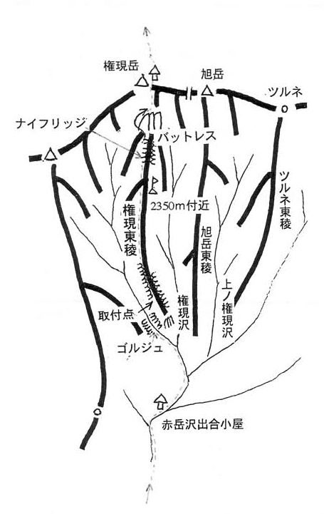 権現沢左俣に入りしばらく行くと、巨大な門のような切り立った岩壁に挟まれたゴルジュ帯になる。高さは40~50mはあるだろうか?なかなかの迫力で、ソフトクリームみたいなふきだまりのなかで幻想的な景観である。ゴルジュを抜け、すぐ右手の扇状のルンゼが権現岳東稜の取付になっている。ルートは真ん中から左側よりにとるが、なんせ雪が悪い。新雪なのに表面パサパサ。中はグサグサでアイゼンだんご状態になるという、イヤな雪質に苦労しながら30分位かけて尾根上にようやく乗った。