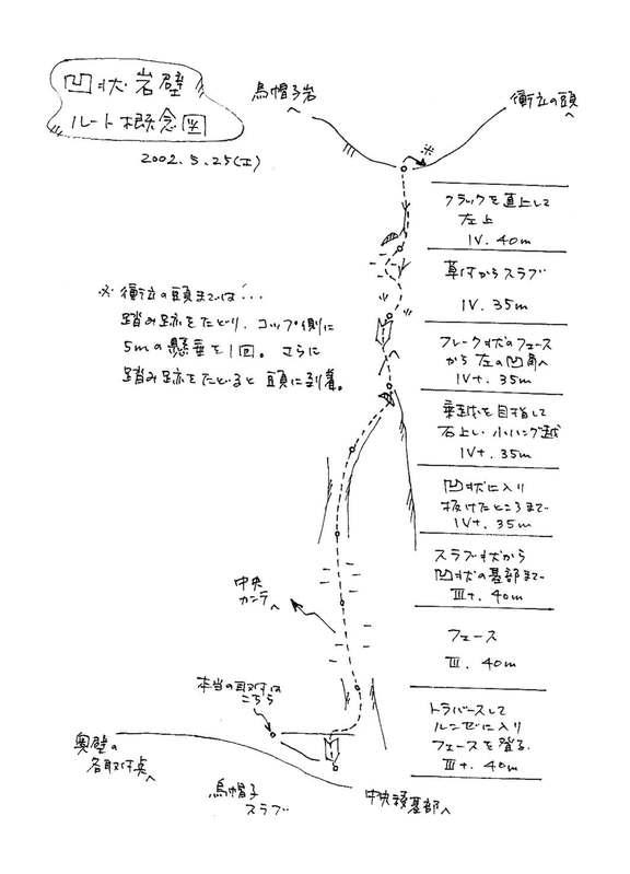 ゴールデンウィークも終わり、雪山装備も片付けて、次は岩だなあ… と「日本の岩場」を眺めている時に突然「そうだ!凹状岩壁を登ろう!」と思った。凹状岩壁と言えば初登が冬期であるし、その名の通り凹状ということもあり、ガレて薄暗くて落石が多い、というイメージがあって今までは何となく敬遠していた。しかし、予想とは全く違って(自分の勝手なイメージでした、反省…)、フェース、スラブ、小ハング、凹角、ルンゼ、クラック、草付など何でもありで、とても素敵なルートで、私たちのお勧めルートに名前を載せました。
