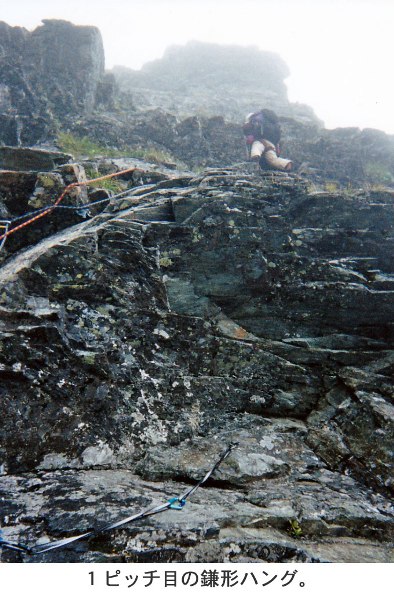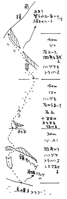 1ピッチ目は坂本、右上気味の凹角を登り、小ハングを越えるためにアブミで伸び上がってみるが、支点がない.本当に崩れたようだ。ハーケンを打ち足そうにも、さらに崩れそう。降りようかなぁ…と思ったが、右にトラバースできそうだ。