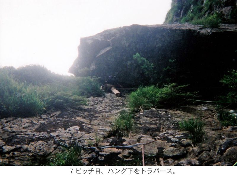残置ハーケンやブッシュはあるし、ガバもあるけれど、ハング下のトラバース部分は濡れていてけっこう恐い。(事実上、ここが最大の核心部だったように感じた。) そうこうしている時に今度は多鶴ちゃんのエイト環が、これまたけたたましい音をたてて烏帽子スラブに落ちていった。