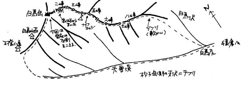 ガイドによると6峰と3峰が急で2峰が岩峰とあるが、顕著なピークとそうでないピークが入り混じっていて、どれが○峰なのかよくわからなくなる。地図上のピーク2つは8峰と5峰だろうと思うんだけど。5峰の手前で女性パーティが雪洞掘りを始める。さらにナイフエッジを越えて登った白馬沢側に先行パーティが幕営していた。私たちはもうひと登りしたところを幕営地に決める。4~5人用も張れそうな場所だ(ここが4峰か?)。少し掘り下げながらテントを設営し、4隅をバイルで固定する。夜はほとんど風がなく、ザラメ雪なので水もすぐ出来て快適であったが、濡れたインナーブーツは乾かずじまいであった。