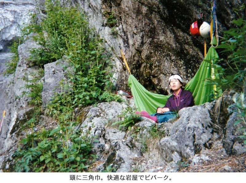 朝、キャーキャー騒ぎながら渡渉してくるパーティーの声で目が覚めた。いっけねえ寝坊しちまった。あわててツェルトをたたんで出発する。1ルンゼ押し出しの急なガラ場を息を切らして詰めていく。30分ほど登ったところで、多鶴ちゃんに落石というアクシデントが発生!まだアプローチなのでヘルメットをかぶっていなかったから、後頭部に幅1cm・深さ1mm位の裂傷を負ってしまった。減菌ガーゼと三角巾で応急処置をしたあと、しばらく休む。たいしたことはなさそうだけど、出血があったし、なんだかいつもの威勢のよさがなくなっちゃったみたいなので、とりあえずT4尾根の取付まで登って今日一日、大事をとって様子をみることにした。