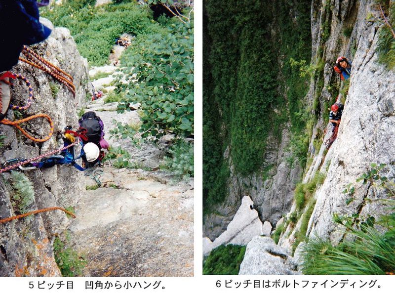 高度感のある見事な垂壁を快適な(?)アブミの掛け替えでグイグイ登っていく-。支点にあまり刺激を与えないように、そぉ~っとアブミに乗るのは何度やっても気持ちのいいもんじゃない。やがて頭上のハング下まで4mというレッジでピッチを切る。ここからハングを目指して人工でさらに登り、ハング下の窮屈なバンドを右へトラバース(Ⅳ、 A1)。さらに草付きを右へ回り込んでつなぐと、左上へすっきりと広がる東壁ルンゼへと出る。