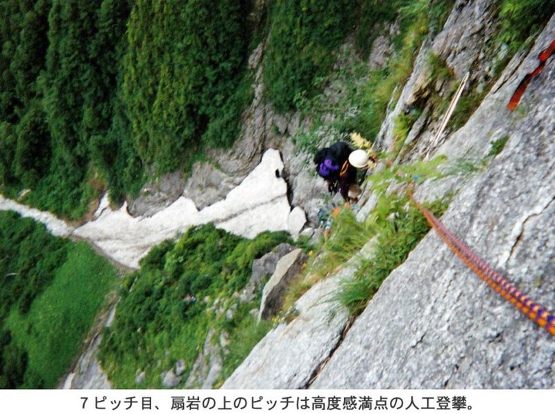 ルートは扇岩から垂壁をまっすぐ直上している。7ピッチ目(Ⅲ、A1)は玉リード。初登時はここが核心部で、攻略するのに丸2日間かかったという。今ではボルトラダーになってしまっていて、アブミの最上段に立つこともない楽チンな人工で登れてしまう。ただし、残置ピンはかなり老朽化したものが多く、ボルトの効きは保証できない。ちぎれたボルトリングの代わりに靴ひもで代用された古いボルトが点々とつづく。しかも、その靴紐も荷重がかかれば今にもちぎれてしまいそうに古いものがぶらさがっている。こんなものに全体重をかけて登れっていうのか!これが噂の靴ひもビレイ。少し左のラインはフリールートになっている(「ロックアンドスノー」誌によると、5.11c~d)が、当然人工で登る。「オールフリーで一撃ですよ!」と、涼しい顔で言っていた船橋山の会のフリークライマー市原さんはやっぱり凄い!