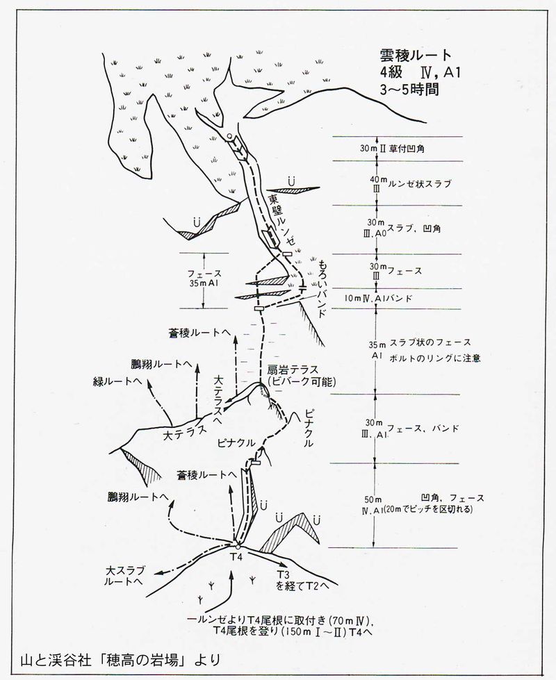 • 東稜も雲稜ルートも、かなり古い残置ハーケンや(リングが欠けた)リングボルトが多い。靴紐シュリンゲやリベットハンガーを持つ事や、支点のチェックも怠りなく。ランニングビレーは、登り出しには特に多めに取ること。