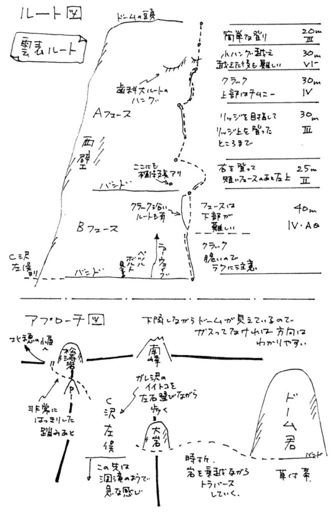 滝谷のドーム西壁はドーム正面壁とも呼ばれ、傾斜も平均斜度が80度と急である。そして、その急傾斜の壁の弱点をついて1955年8月に雲表倶楽部の望月亮、上原米蔵が初登攀した雲表ルートは、現在ではピッチ最高グレードはV、A0であるが、当時のグレードではV、A2であった。