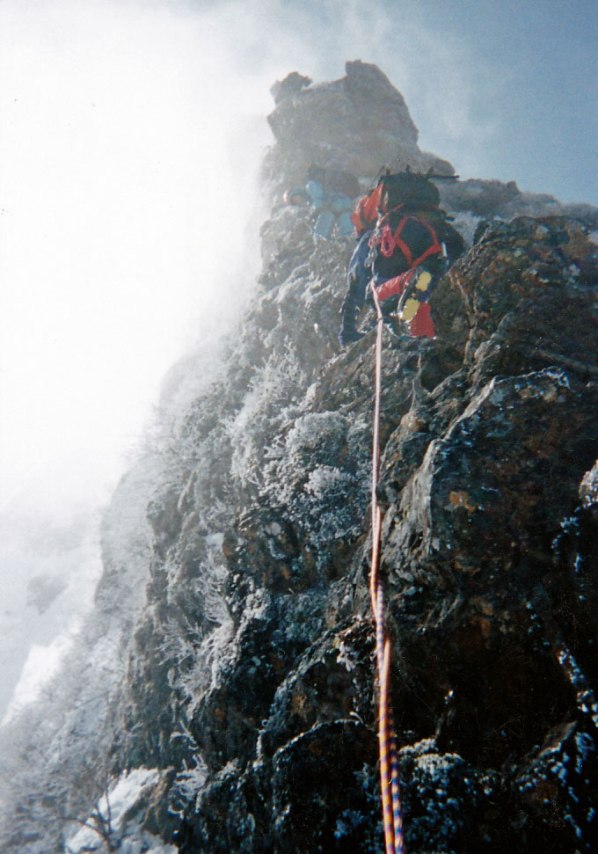 第一岩壁の手前、2ピッチの所でザイルを結んでビレイ。雪の状態がイヤラシく、摩利支天沢側から巻いて第一岩壁の基部へ。先行パーティーは、ここを第二岩壁と勘違いしたらしく左側の雪壁から巻いている。第一岩壁は約5m。出だしが立っているし、ランニングビレーが取れないのでイヤな感じだ。岩は表面が凍っていてツルツルしている。ここは浅いクラック沿いに多鶴ちゃんが軽やかにリードする。つづくピッチはナイフエッジの岩稜帯から第二岩壁の基部へ。ハーケンが多いので助かるけど、なんせ細いし岩がモロそうなので緊張した。